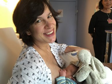 J’étais dans les bras de Maman sur le lit de la maternité en train de me remplir goulûment la panse, quand tout à coup Papa a ouvert la porte, et là, je l’ai vu pour la première fois !
