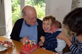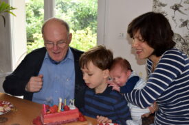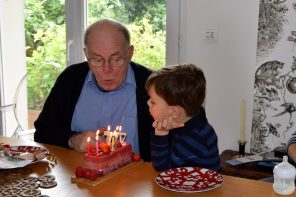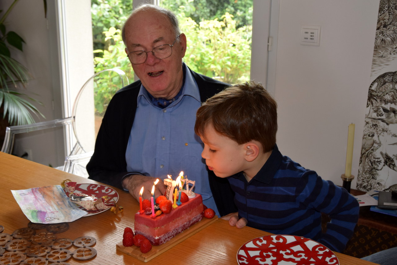 Aujourd’hui c’est l’anniversaire de Papiji ! Avec Neil, on a soufflé très fort sur les bougies pour aider Papiji à les éteindre.